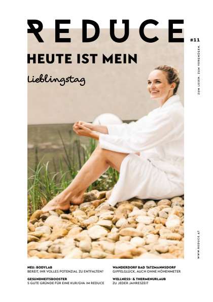 Unser neues REDUCE Journal bietet spannende Einblicke in unser brandneues BodyLAB, unsere Thermenhotels REDUCE Hotel Vital****S und REDUCE Hotel Thermal****S, unsere Heilschätze aus der Natur sowie über einen Kur oder GVA Aufenthalt. Entdecken Sie Inspirationen, Informationen und Angebote für Gesundheit und Wohlbefinden..